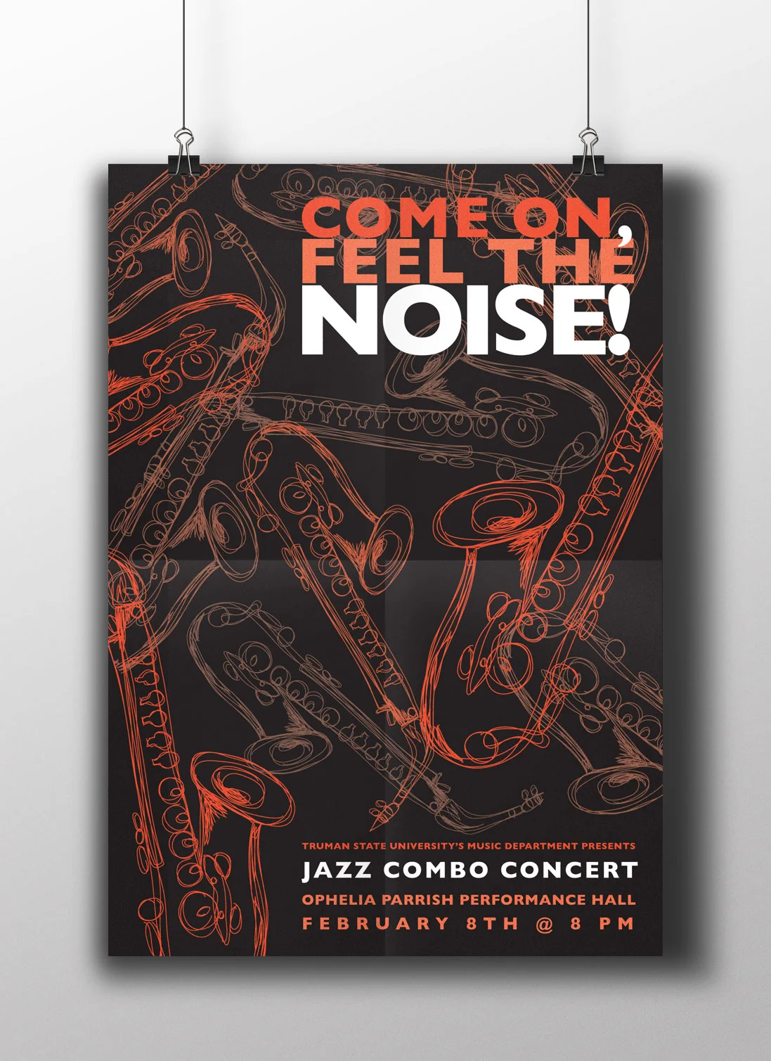 This project completed in my Visual Communications II class consisted of designing a poster that would be displayed on and around Truman State University's campus to promote the music department's Jazz Combo concert. The design had to be eye-catching and interesting, as well as have a concept that would attract non-music majors.