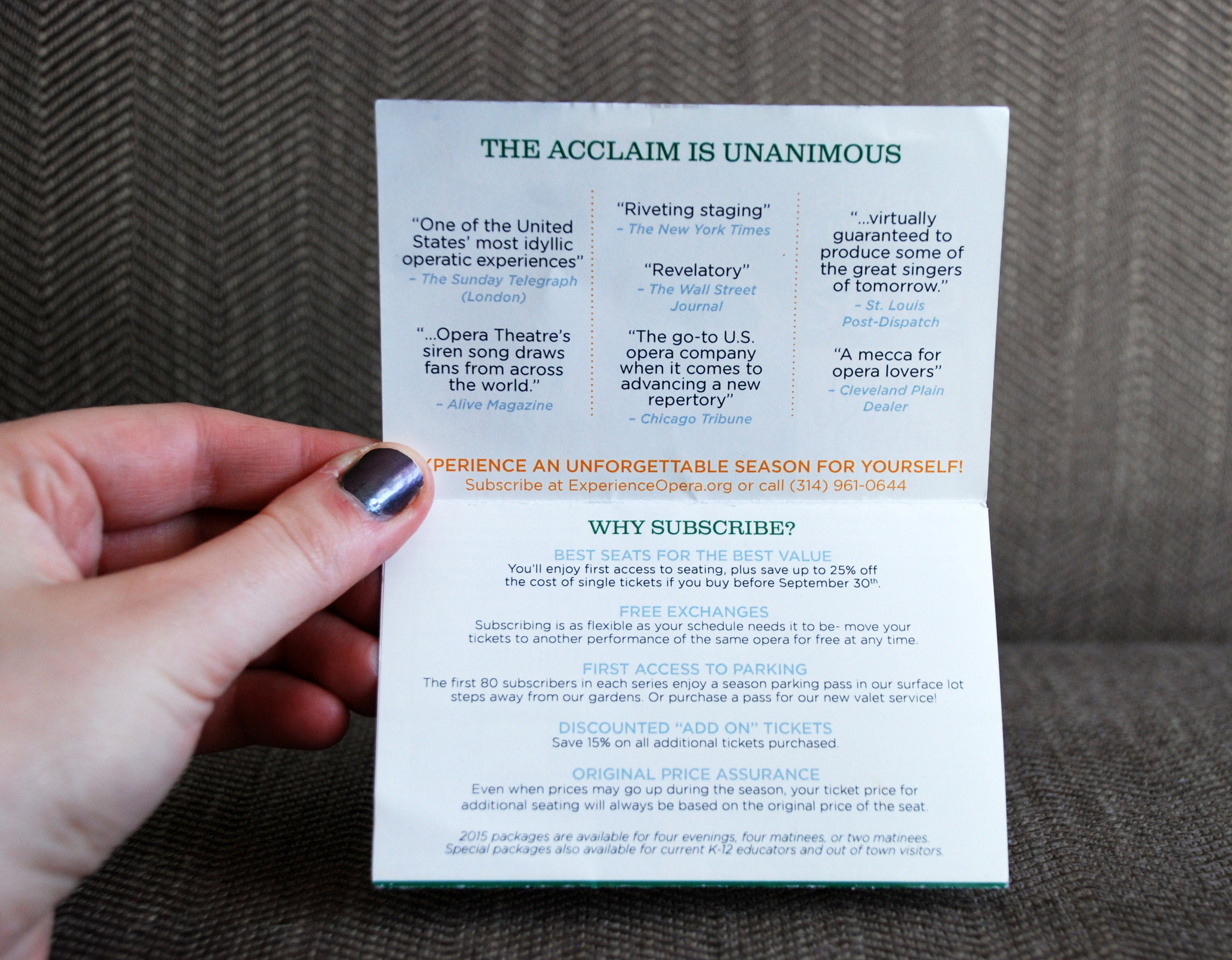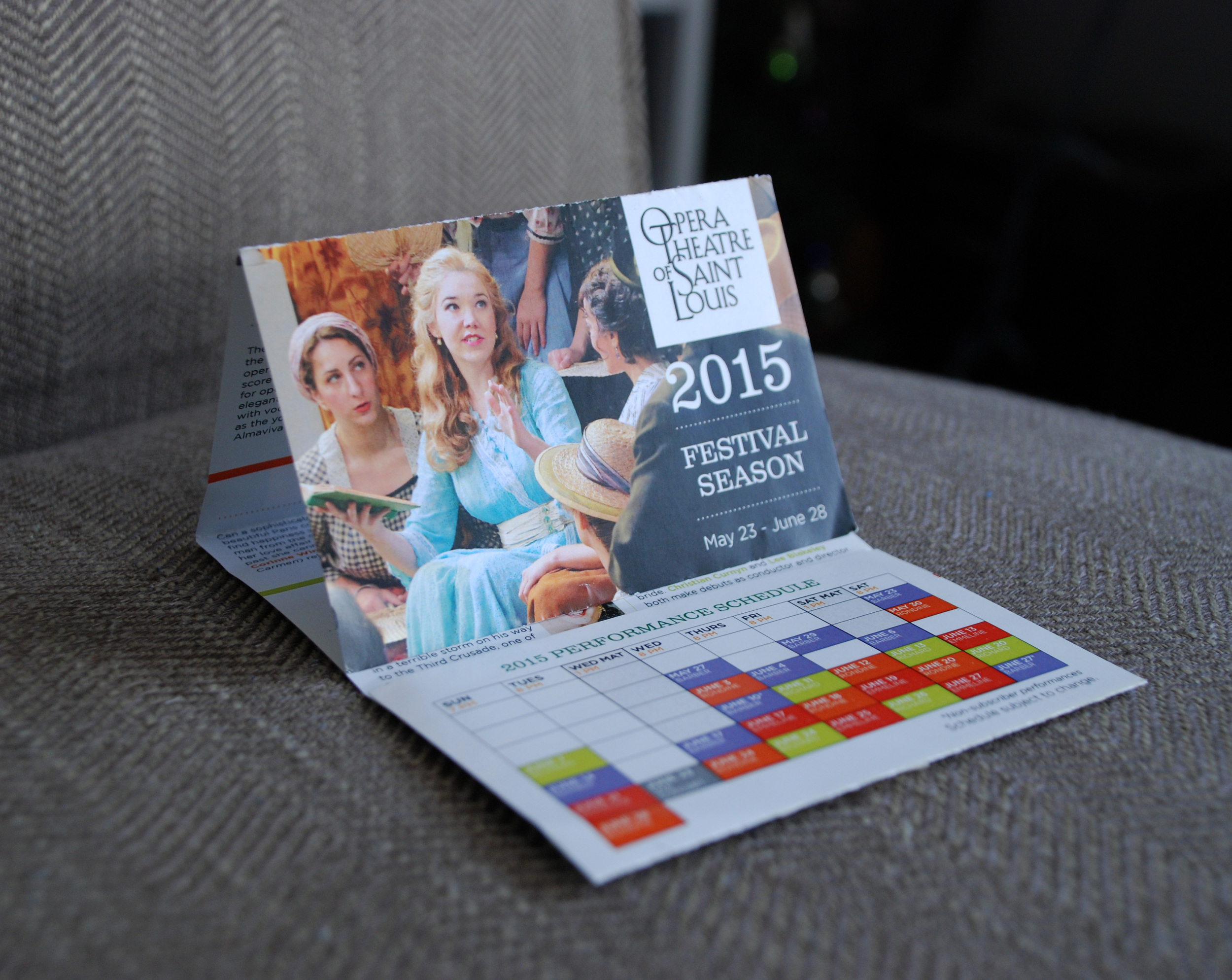 Opera Theatre of Saint Louis wanted a pocket calendar displaying information about the 2015 season, as well as the official calendar for the season. The pocket calendar was handed out to opera guests at the end of the 2014 season to get them excited about the upcoming season!